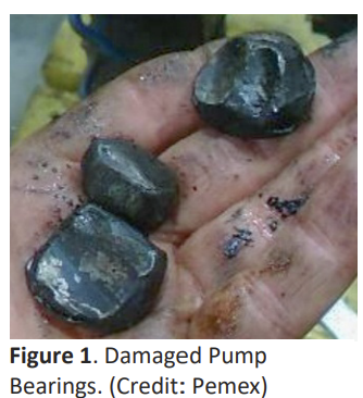 在事故发生前约五天的装置启动期间,由于上游设备液位过低,该离心泵在近两小时内处于低吸入(入口)压力状态运行。低吸入压力导致泵发生气蚀,引发泵体振动并损坏轴承(图示)。 五天后的3月14日,损坏的轴承及由此产生的机械密封应力导致密封失效。泵内高温碳氢化合物释放至大气中并引燃,引发火灾。物料被释放至590华氏度(°F),其自燃温度为484°F。