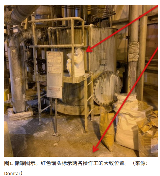 事故发生时,三名操作工正执行循环酸性清洗溶液的任务,旨在清除影响设备性能的固体沉积物。该操作要求操作工直接站在储罐上方,将固态氨基磺酸粉末倒入罐体开口处。