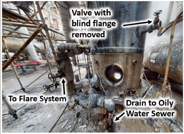 CSB确定事件的原因是操作人员打开阀门并移除加压燃料气混合桶上的法兰,将易燃液体石脑油直接释放到地面。释放到地面后,易燃液体形成了一个蒸汽云,达到了附近的点火源,导致了闪燃。