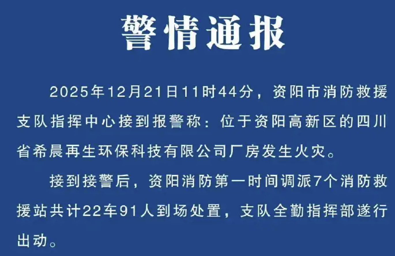 2025年12月21日,四川资阳四川省希晨再生资源有限公司在当天上午发生火灾,现场冒起滚滚浓烟。14时30分许,资阳市消防救援支队发布通报表示,现场无人员被困,目前火势已基本得到控制。