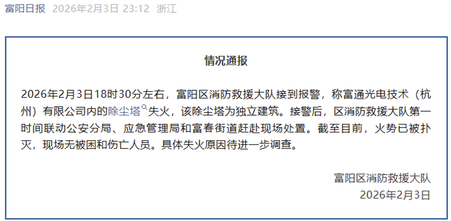 2026年2月3日18时30分左右,富阳区消防救援大队接到报警,称富通光电技术(杭州)有限公司内的除尘塔失火,该除尘塔为独立建筑。接警后,区消防救援大队第一时间联动公安分局、应急管理局和富春街道赶赴现场处置。截至目前,火势已被扑灭,现场无被困和伤亡人员。具体失火原因待进一步调查。...