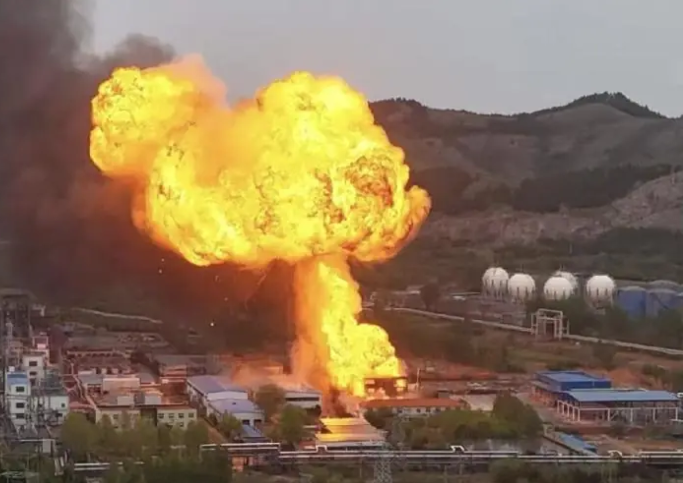 初步了解,九圣化工产品暂存罐(容积约6吨,罐内物质为二叔丁基过氧化物)起火,引发生产车间过火。